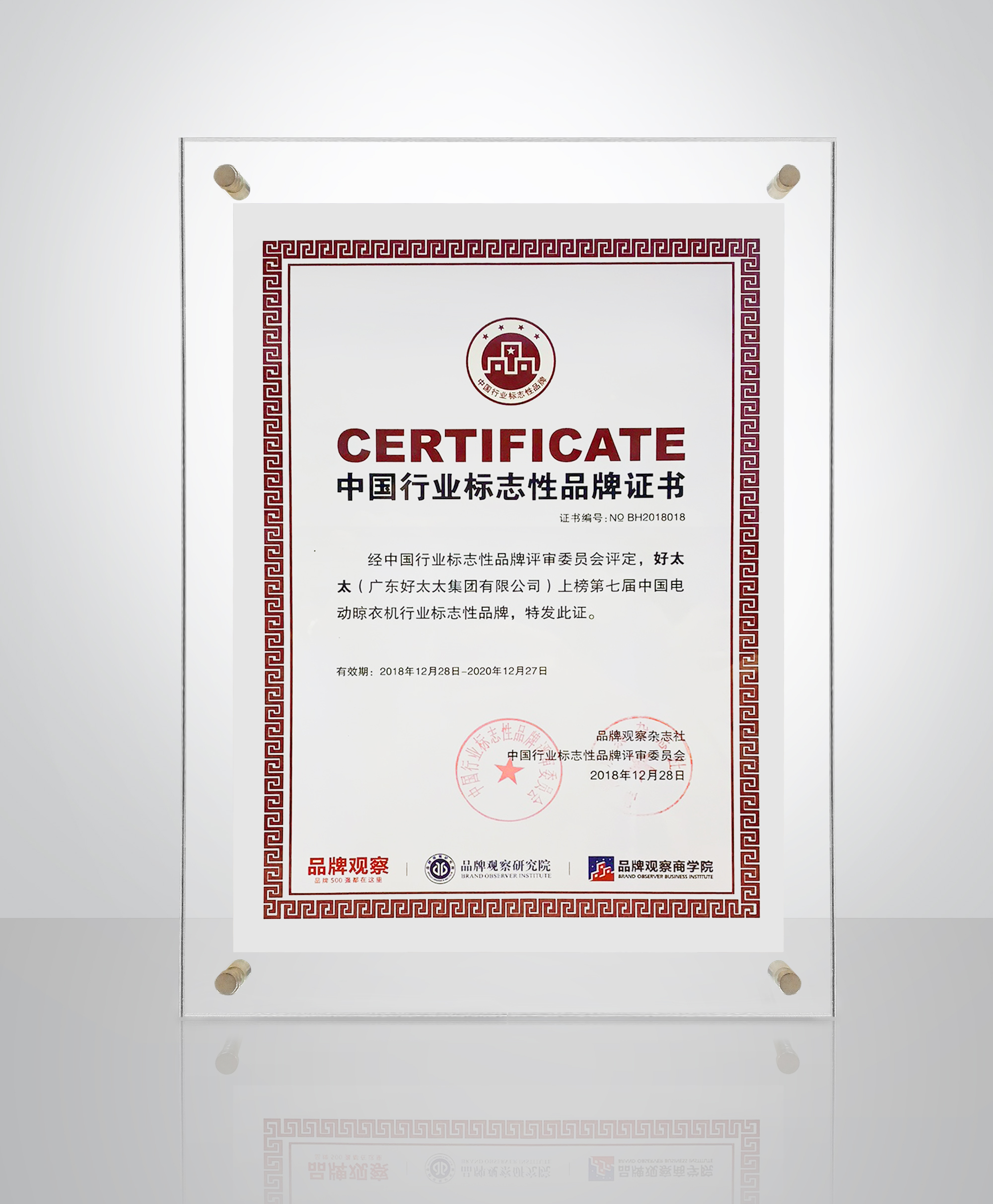 好太太凭着完美的品质细节、销售口碑,荣获“第7届中国行业标志性品牌”殊荣,无可争议的成为晾晒行业领导品牌!