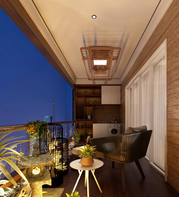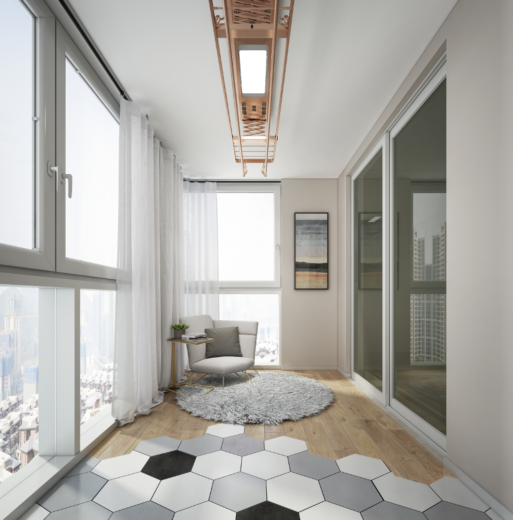 在本次金企鹅美居设计大赛中,一等奖设计师曾炎威将阳台原有的护栏,改为上部可推拉式落地窗,且不影响采光通风的条件下也保证了业主的私密性及安全感。在空间布置上以地面材料的形式划分为休闲区和工作区。休闲区地面为仿实木木纹砖,工作区域为黑、白、浅灰三种颜色的六角砖,黑白灰与原木肌理的交织使空间营造出的一种生机与美感,墙面的米黄暖色基调,融入好太太智能晾衣机,实用、简约,展现阳台的无限可能。
