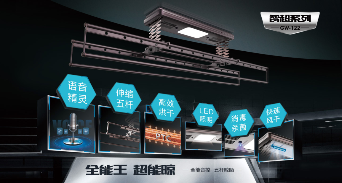像好太太智能晾衣机GW-122系列,4伸缩杆加1小晾杆的设计就非常实用了。伸缩杆可已在1.6米到2.4米间自由切换,晾晒容量增加50%,最大承重35Kg,可实现同时晾晒10个人的衣物。利用中间的小晾干晾晒孩子衣物、贴身衣物和毛巾等小物件能最大限度的节省空间,并因正对消毒灯,达到最优的消毒效果。