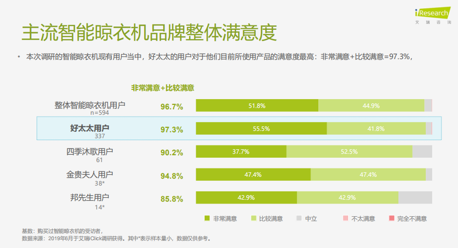 经过深入调研后,艾瑞在晒衣节当天发布《国货当智强——家居晾晒智能化趋势洞察报告》,报告显示,消费者普遍认同的国货家居代表品牌有好太太、水星家纺、欧派、富安娜与九牧等。此外,好太太在主流晾衣机品牌的整体满意度是最高的,并且在智能功能、材质做工或者安装售后等任何一个维度上看,好太太都是当仁不让的行业第一名。