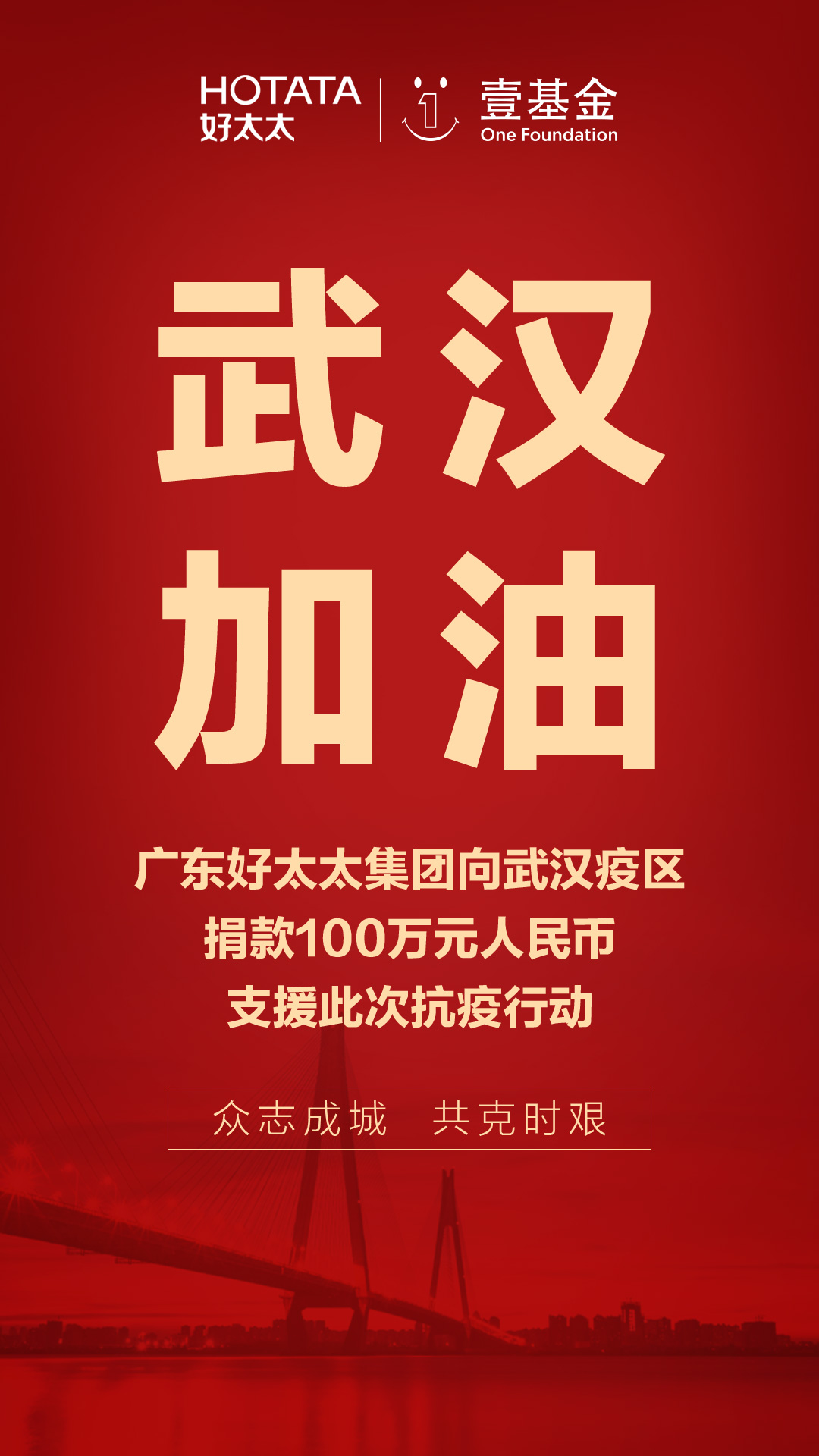 太集团携手壹基金驰援武汉捐款100万用于抗疫行动,援助湖北抗击新型冠状病毒,百万抗疫物资即将发往疫区,愿疫情早日结束。