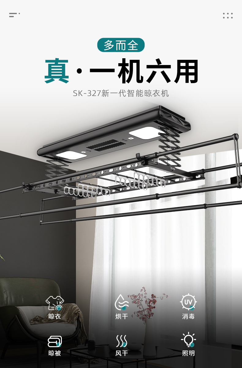 晒客SK-326智能晾衣机:小机身大晒量,外观简约,且具备广角照明,静音升降等功能;晒客SK-327智能晾衣机:集晾衣、烘干、消毒、晾被、风干、照明等功能。