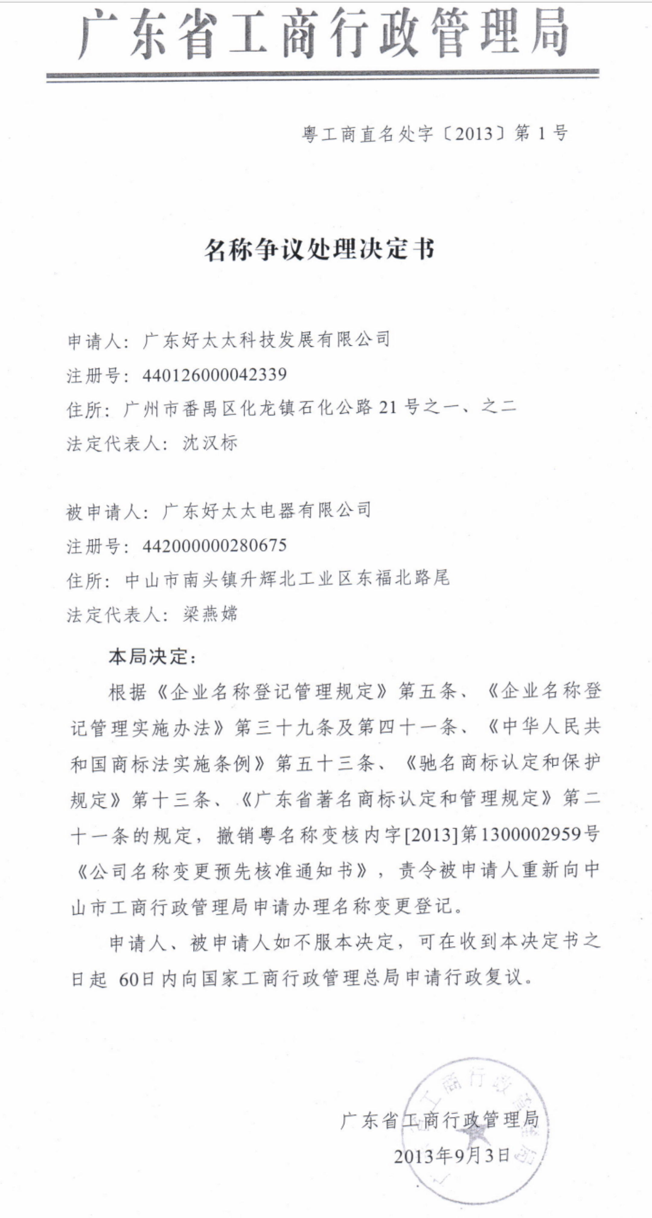 2009年11月20日,时称中山市好太太电器有限公司的法定代表人老健明设立了中山市好生活电器有限公司,后于2013年1月30日更名为“中山市好太太电器有限公司”、于2013年2月27日更名为“广东好太太电器有限公司”。因该企业名称中再次使用“好太太”字号涉嫌不正当竞争,被广东好太太集团向广东省工商行政管理局投诉,于2013年9月3日被广东省工商局责令变更企业名称。