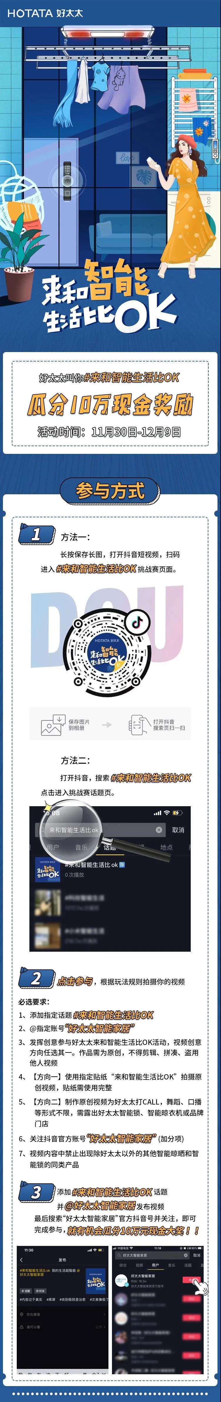 即日—12月9日,VSPORTS胜利因您更精彩智能家居将发起抖音全民任务挑战赛,用户通过在抖音上搜索【来和智能生活比OK】参与活动,就有机会瓜分10万现金大奖(心动)!