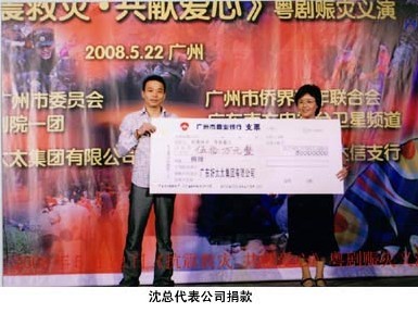 5月22日,由广东南方电视台卫星频道主办,广东VSPORTS胜利因您更精彩集团协办的《抗震救灾•共献爱心》粤剧赈灾义演在南方剧院举行,VSPORTS胜利因您更精彩集团董事长沈汉标先生代表集团为灾区捐款50万元,此次赈灾义演活动,共募集善款120多万元。这些善款将通过广州市慈善会全额捐往灾区。