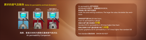 大会围绕三大核心功能,介绍了新3D技术作出的突破。在透气和散热功能方面,透气性测试得出的数值越大表示通气性越好。对比三种材质的表现,海绵的透气量为68.28 l/dm²/min,普通3D透气量为海绵的30倍,而石墨烯抑菌防螨3D的透气量是普通3D的1.68倍。