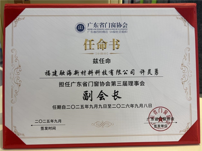 领航担当,共谋发展许董当选副会长,不仅是个人荣誉,更是行业对融海综合实力的高度信任!作为协会核心成员,融海将深度参与行业标准制定、技术交流与资源整合,携手同行推动门窗行业向绿色化、智能化、高端化迈进。